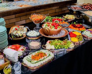 Buffets completos para grandes eventos, com opções para diferentes momentos do dia.